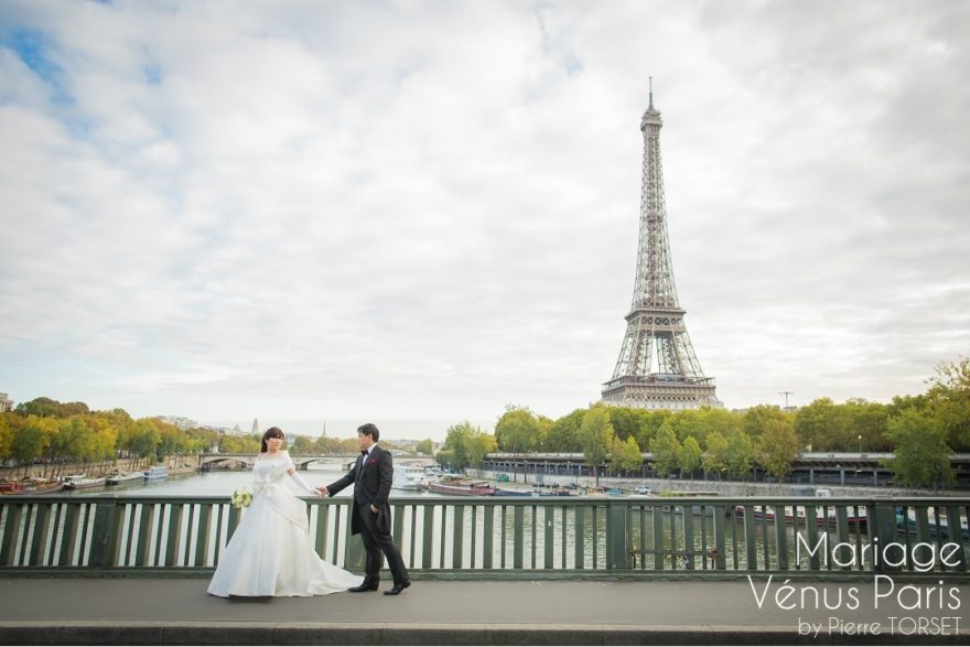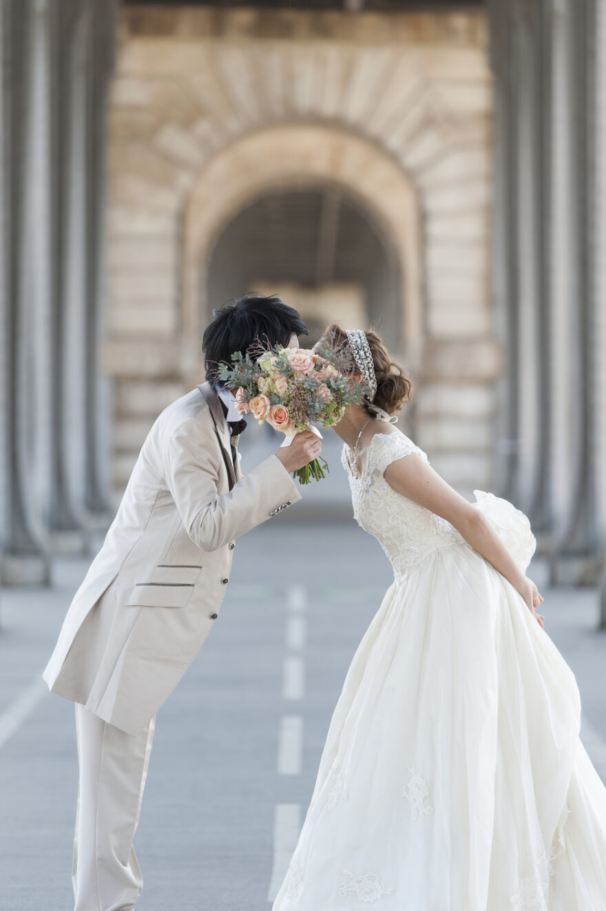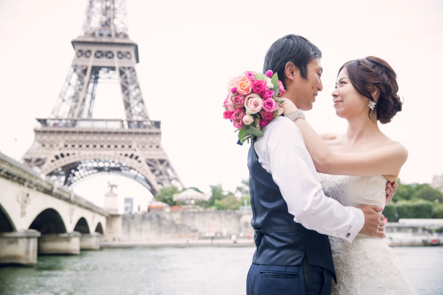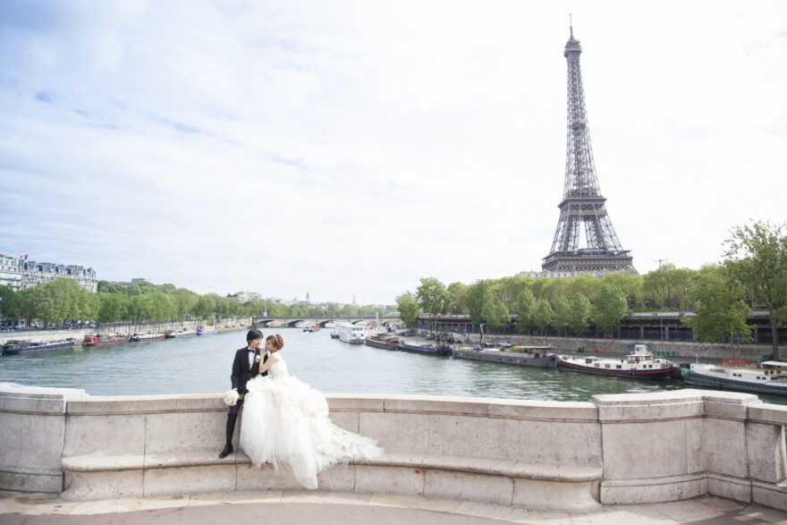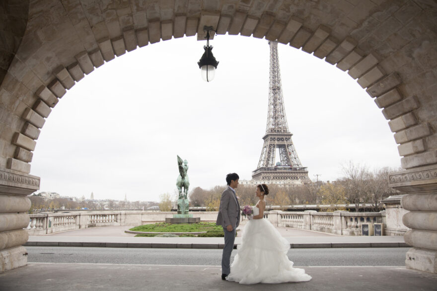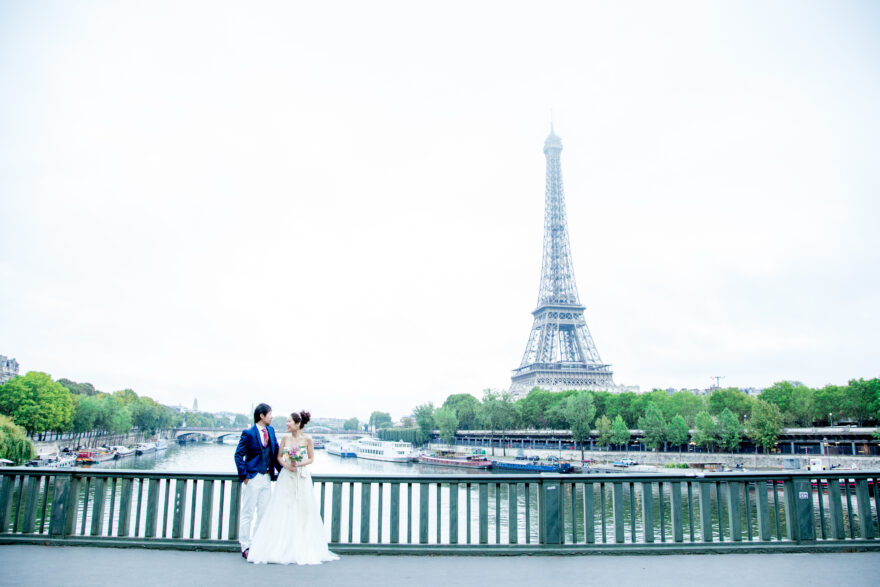 エッフェル塔が見えるビルアケム橋でウェディングフォト